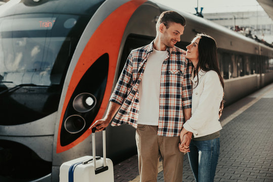 Positive male watching at smiling girlfriend with loving look while keeping arms together. They talking together on railway station before journey