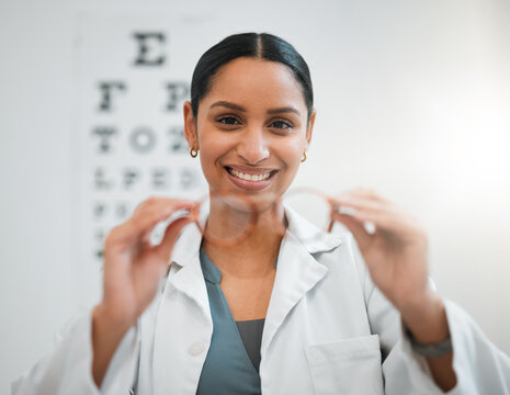 Doctor, woman and glasses, vision and eye care, portrait and optometry with health and smile. Prescription lens, frame choice and healthcare, eyewear and optometrist with wellness and medical service
