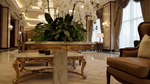 An opulent restaurant interior featuring a stunning floral arrangement on a round table, inviting guests to indulge in an exquisite dining experience surrounded by aesthetic charm.