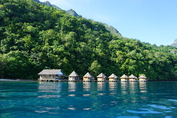 A row of traditional stilt houses above the beautiful Ora Beach with its green sea and beautiful coral reefs, Maluku, Eastern Indonesia