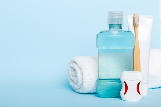 Mouthwash and other oral hygiene products on colored table top view with copy space. Flat lay. Dental hygiene. Oral care products and space for text on light background. concept