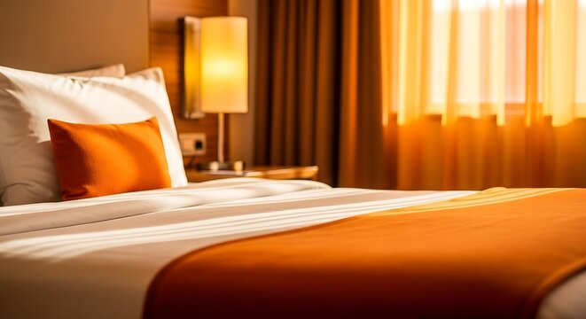Cozy hotel bedroom with warm lighting and inviting orange accents