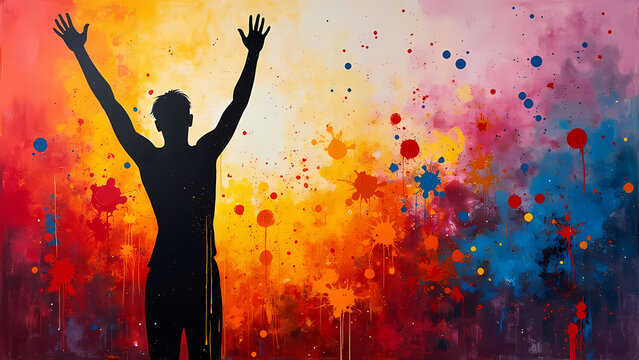 Construction Worker Raises His Arms in Victory Against a Stunning Sunset Over a Cityscape
