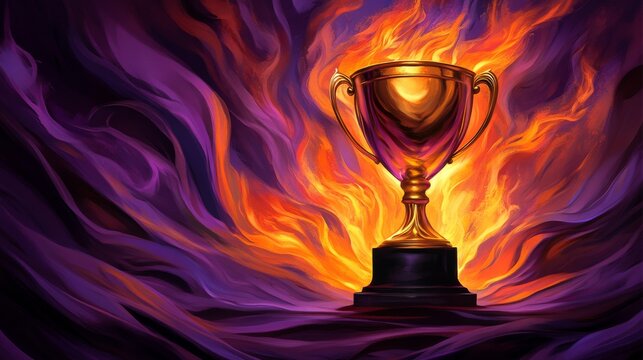The Golden Trophy's Fiery Ascent, Digital Painting, Purple and Orange, Achievement, Trophy, Fire