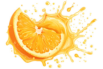 Fresh ripe slice of orange fruit with juice splash, isolated illustration on transparent background. Healthy food and tropical fruit drink, splashing fruit beverage liquid. PNG, cutout.