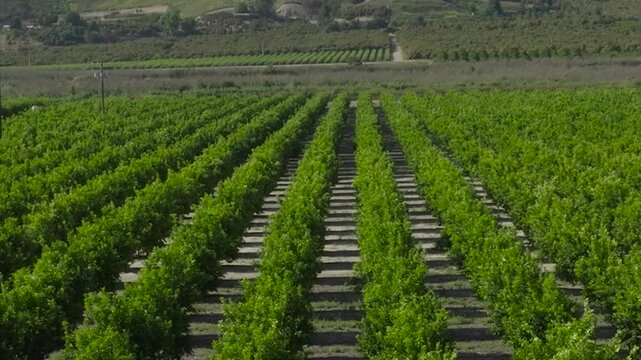 Aerial view of Florida farmlands with rows of orange grove trees growing on a sunny day