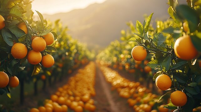 Lush orange grove with rows of orange trees stretching into the distance their branches heavy with ripe fruit and the warm sunlight casting long shadows across the orchard floor
