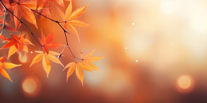 A composition of vividly colored autumn leaves in shades of red and orange set against a soft blue background, creating a striking contrast.