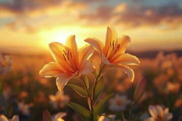 Vibrant orange fire lilies sway gently in a lush green meadow, their glistening petals radiate warm light, resembling flames under the intense noon sun.