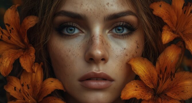Bright orange lilies in a lush garden setting, semi close-up, more clarity with clear light and sharp focus, high detailed