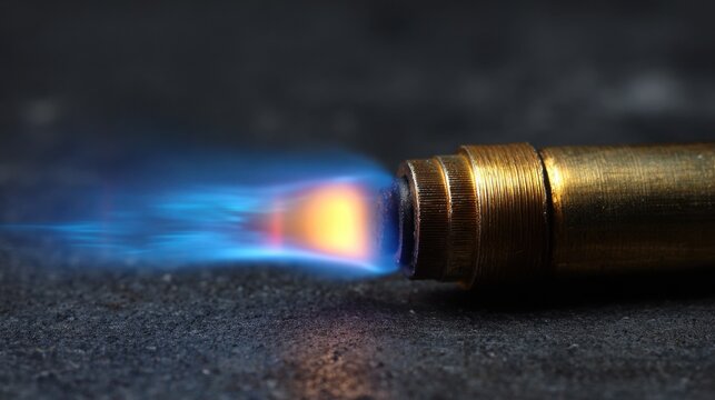 A powerful narrow orange laser beam cuts horizontally across a stark black background The beam terminates in a bright energetic burst scattering glowing embers and sparks