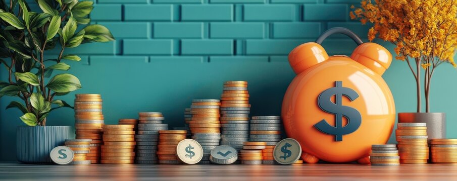 A vibrant scene featuring an orange alarm clock shaped like a piggy bank surrounded by stacks of coins and potted plants against a teal brick wall.