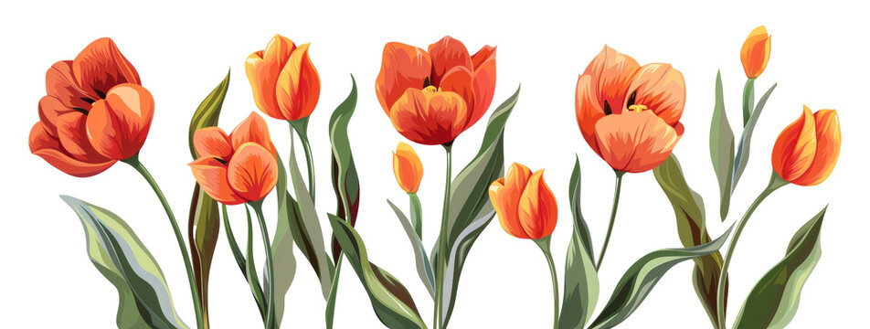 Vibrant orange tulips with green leaves on a clean white background. Perfect for springtime and floral themes