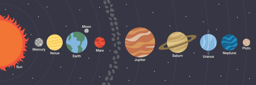 SOLAR SYSTEM planets order flat clean illustration background decoration universe outer space sun milky way saturn pluto moon jupiter earth wallpaper astronauts cosmonaut