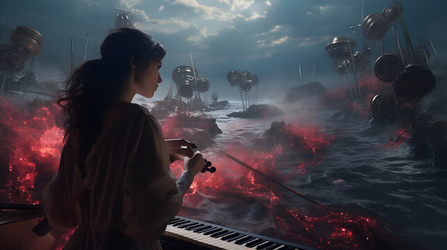 A young woman holds her violin, gracefully playing in an orchestral setting, her expression full of joy, surrounded by vibrant lights and fellow musicians.