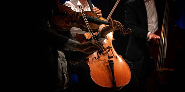 A close-up view of musicians performing on violins during a classical concert, showcasing the elegance and precision of live orchestral performance.