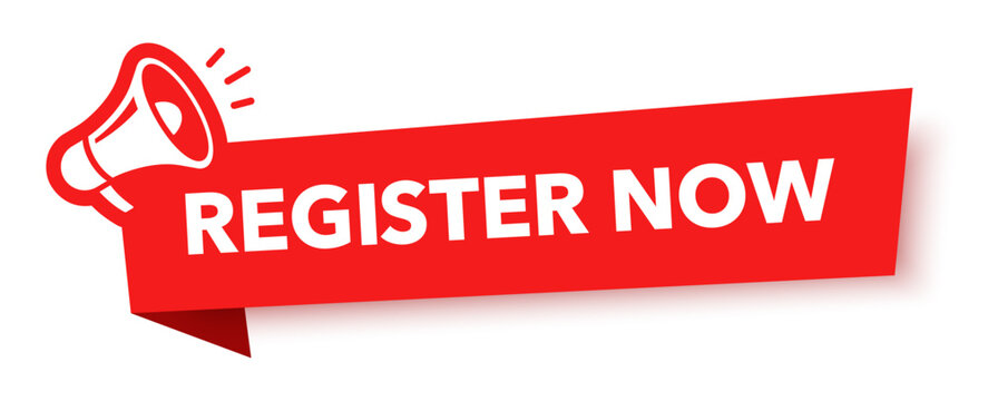Megaphone with register now speech bubble. Loudspeaker. Banner for business, marketing and advertising. Vector illustration.