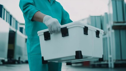 Healthcare worker with a cooler box walks in a shipping yard, indicating cold chain delivery for critical medical supplies