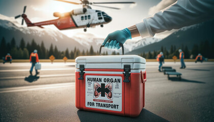 Medical professional carrying a cooler for organ transport, symbolizing organ preservation and transplantation logistics.