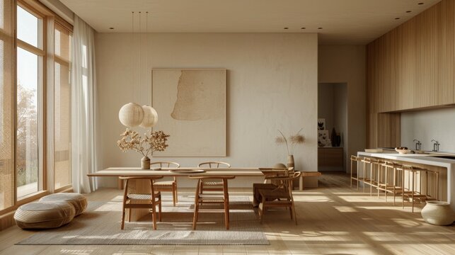 scandinavian dining room, a stylish dining room combining japandi and scandi design elements, showcasing clean lines, light wood furniture, and natural textures for a peaceful ambiance