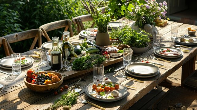 Contemporary Easter brunch setting emphasizing healthy eating, with organic vegetable dishes, freshly squeezed juices, whole grain breads, and a centerpiece of edible flowers and herbs