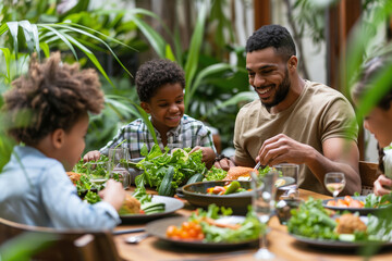 A heartwarming scene of a family with young children smiling and eating a fresh, green meal surrounded by lush plants