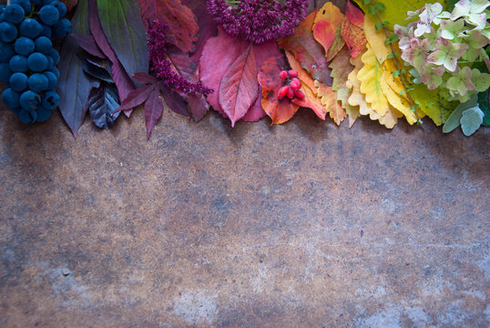 Autumn leaves and berries frame beige background fall. Seasonal foliage fruit border on ecru backdrop autumnal decoration harvest thanksgiving botanical organic nature september