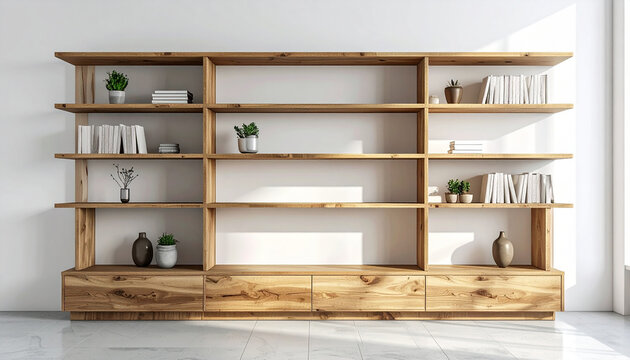 Wooden bookshelf with books and decorative items displayed in organized manner