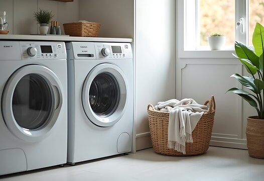 Laundry room with a washing machine and a basket full of clothes Ai generative