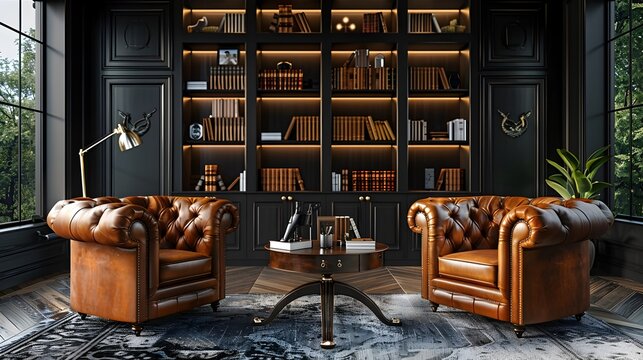 Sophisticated Executive Office with Leather Furniture and Bookshelves for Product Presentation and Accessory Display