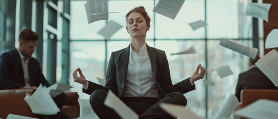 Businesswoman meditating amid flying papers, finding peace in the chaos.