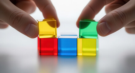 A clean arrangement of white cubes stacked in a modern, minimalist style against a softly blurred background, representing structure and balance.