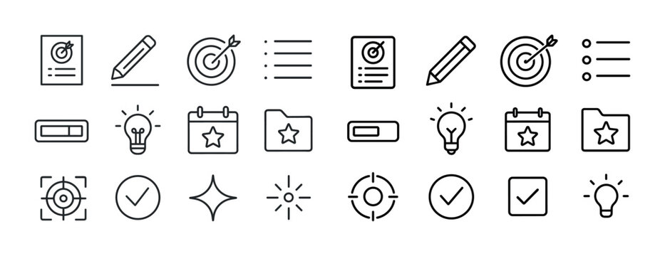 Minimalist icon set with target, pencil, list, bulb, calendar, f