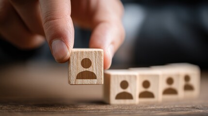 Human resources recruitment concept, hand picking re figure from group of woodn figures