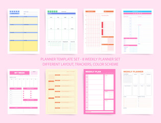 Weekly planner template set of eight unique A4 designs. Printable layouts with trackers, priorities, to-do lists, habit and menu sections; colourful planners for weekly organisation.