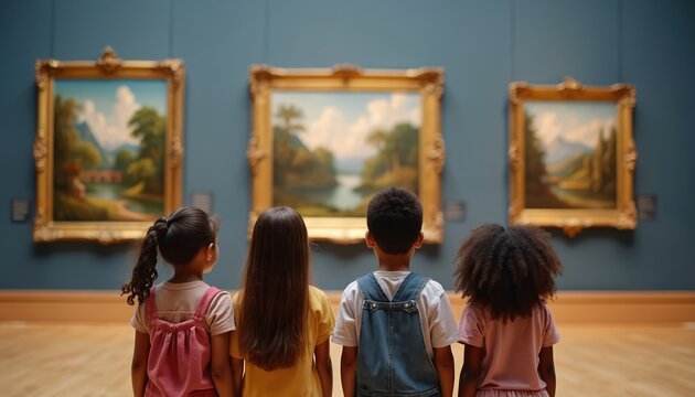 Four young children view landscape paintings in an art gallery. Kids on a field trip admire classical artworks in a museum. Children learn about culture and history inside educational institution.