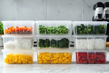 Meal prep containers arranged for the week with fresh ingredients in a kitchen setting