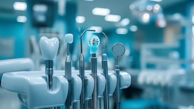 Close-up of dental tools on a tray in a modern dental clinic, conveying professionalism and care