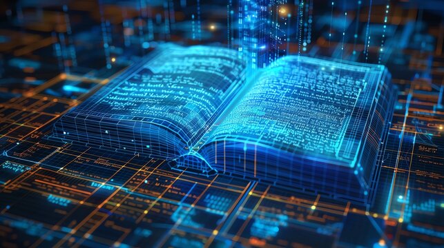 A wireframe model of a book being written, with chapters expanding and ideas connecting