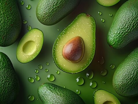 Ultra realistic Hass avocados glistening with water drops showcase nature\'s freshness and vibrant colors in a captivating top view arrangement