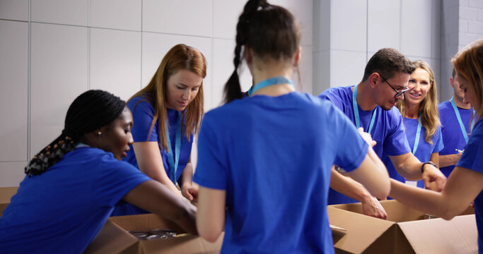 Smiling woman holding donations box for community service