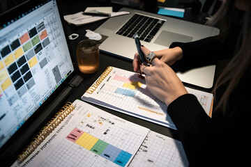 Event planner timetable agenda plan on organize schedule event. Business woman using mobile phone and taking note on calendar desk on office table