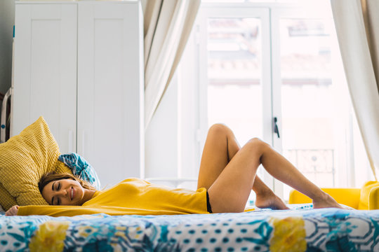 portrait Young beauty woman having orgasm in bed, top view. face horny excited hot female alone pleasures herself in the bedroom lying on the bed. beautiful sexy caucasian brunette holding a pillow