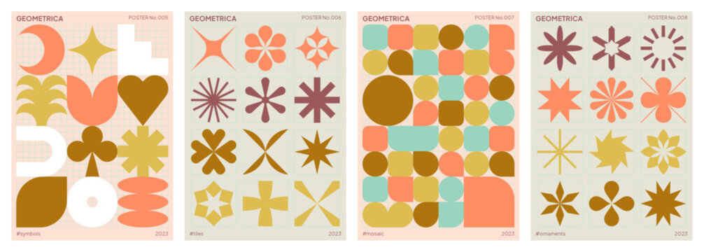 Geometric symbol set. Trendy Neo Geo art. Geometric vector patterns in warm and ochre colors. Abstract, floral and minimalist shapes for tiles, mosaics, textiles, wall arts, prints, posters or covers.