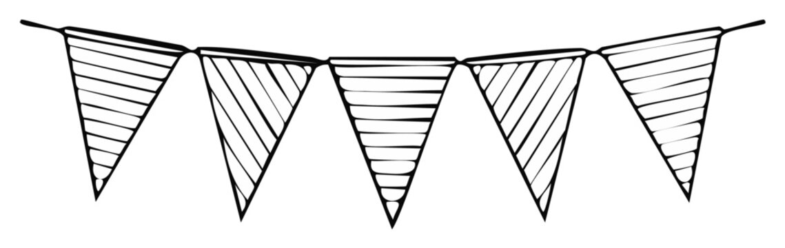 Watercolor illustration of a string of red and orange pennant flags on transparent background.