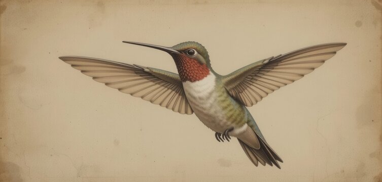 A meticulously detailed hummingbird illustration in sepia tones, evoking a classic ornithological print.