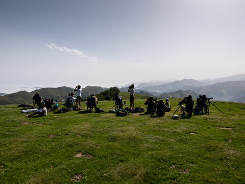 Group of ornithologists looking at birds on a mountain top