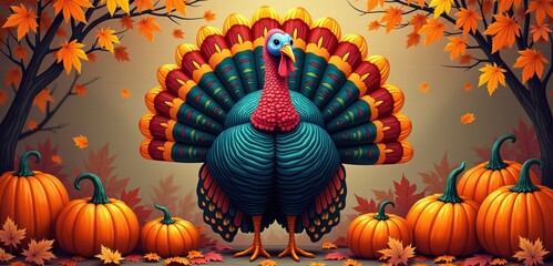 A vibrant and playful turkey surrounded by autumn leaves and pumpkins, ideal for Thanksgiving-themed designs and seasonal promotions.