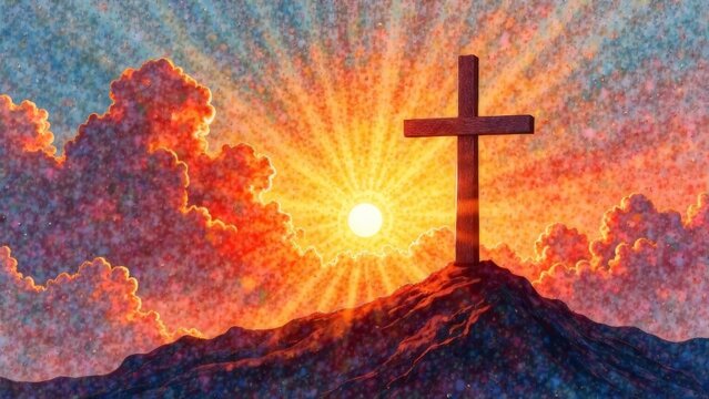 Illustration of a wooden cross on top of a mountain at sunrise.