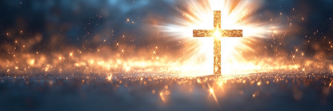 Cross glowing with golden sparkles, symbolizing divinity and rebirth, Easter Christian celebration concept